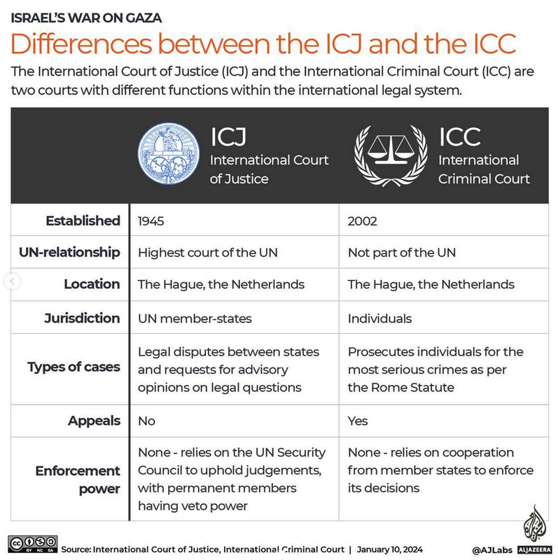 Al Jazeera shared this desk explaining the variations between the ICC and ICJ which I discovered useful:
